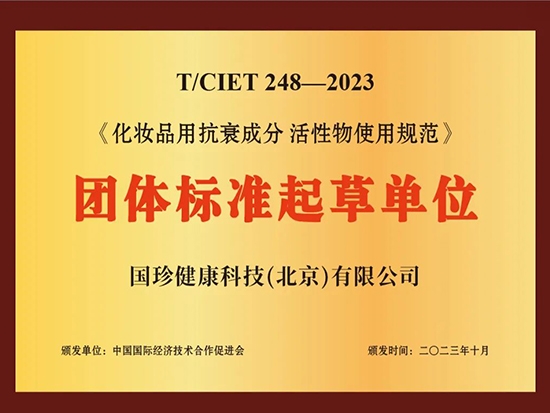 近日,健康工业公司国珍健康研究院携手中国国际经济技术相助增进会,牵头起草并宣布了《化妆品用抗衰身分 活性物使用规范》团体标准(T/CIET 248-2023)。健康工业公司作为该团体标准主要起草单位,在团体标准制定历程中做出了突出孝敬,获得了业内高度评价。